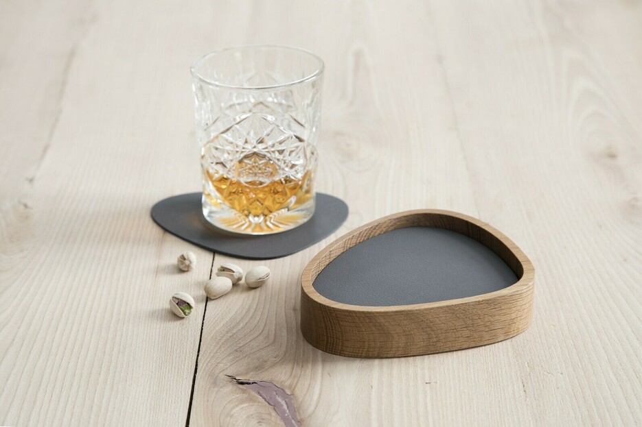 Sets de table, centre de table, sous-verre, marque-verre, ronds de serviette.... en cuir recyclé certifié Oeko-tex (80% cuir, 20% caoutchouc) sont conçus et fabriqués au Danemark.