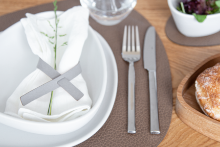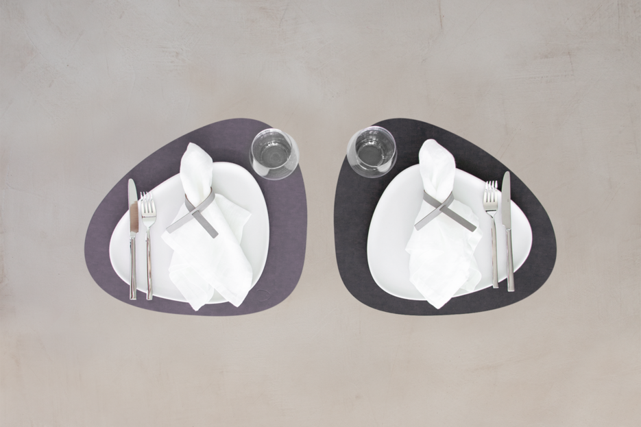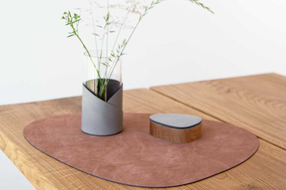 Sets de table, centre de table, sous-verre, marque-verre, ronds de serviette.... en cuir recyclé certifié Oeko-tex (80% cuir, 20% caoutchouc) sont conçus et fabriqués au Danemark.